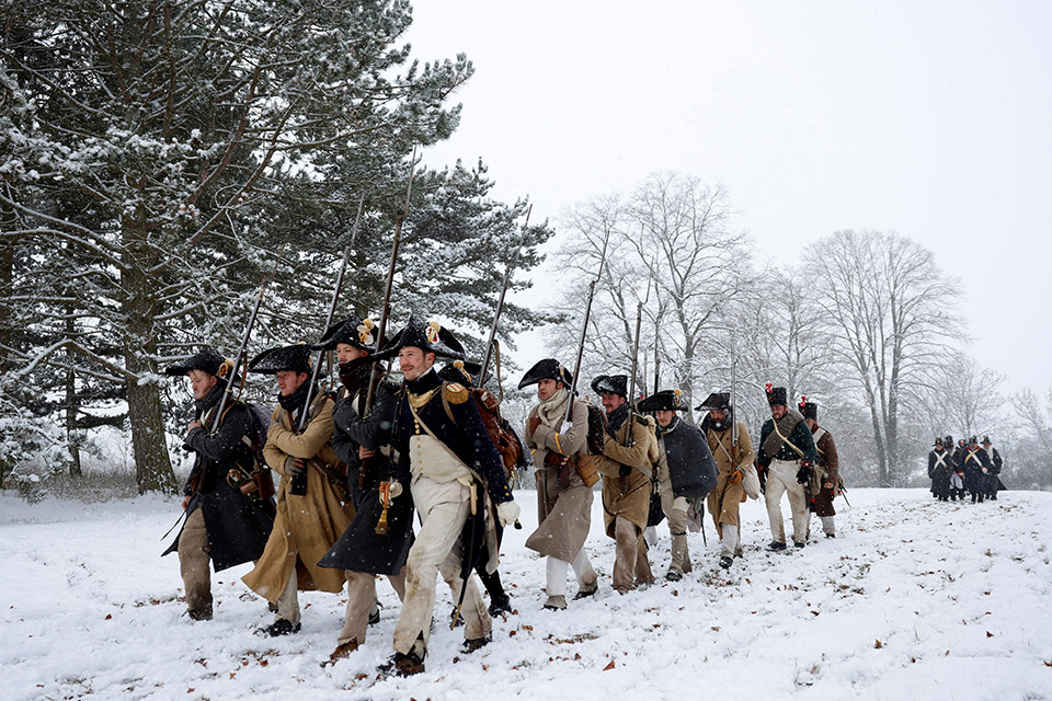 Μην θεωρήσετε ότι η πρόσφατη ταινία του Ρίτλεϊ Σκοτ επηρέασε τους κυρίους της φωτογραφίας. Μάλλον (αν την είδαν) θα θύμωναν με κάποιες ιστορικές ανακρίβειες και καθόλου δεν θα τους ένοιαξαν οι εντυπωσιακές σκηνές από τις μάχες και ας είναι ντυμένοι με τα ρούχα της εποχής. Οι κύριοι της φωτογραφίας, φανατικοί της ιστορίας, βαδίζουν μέσα στο χιόνι όπου θα αναπαραστήσουν μια από τις σημαντικότερες μάχες που έδωσε ο Ναπολέων, την πιο λαμπρή του νίκη, την Μάχη του Αουστερλιτς (2 Δεκεμβρίου 1805), όλα αυτά στην παγωμένη και χιονισμένη Τσεχία.