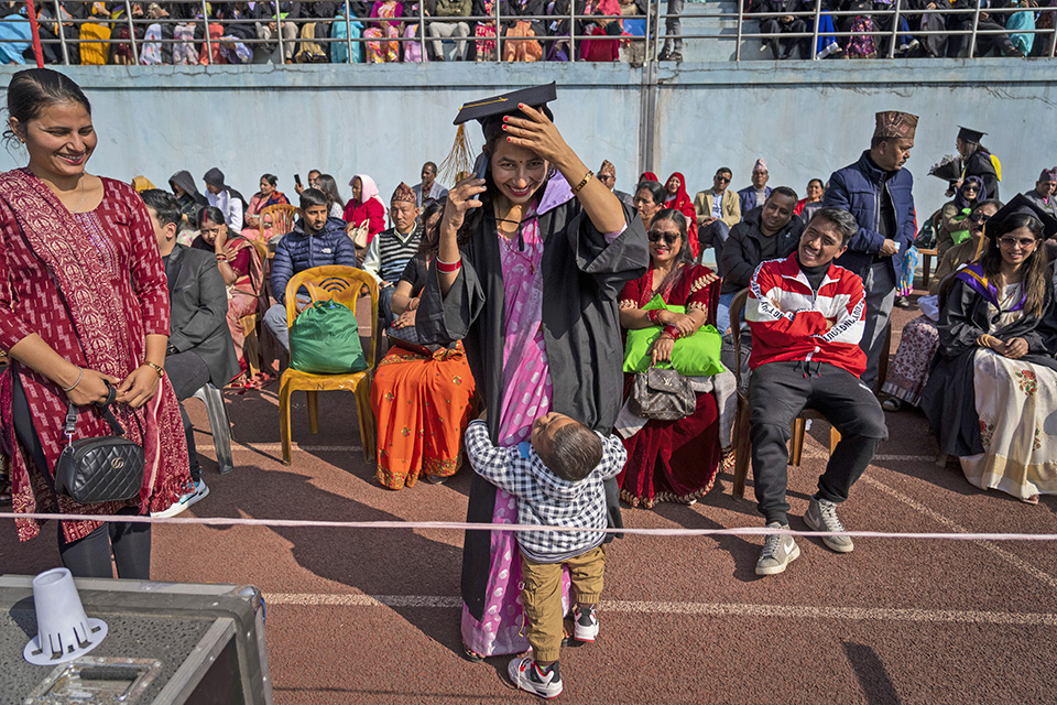 Ενα ρεκόρ θέλησε να σπάσει το παλαιότερο και μεγαλύτερο πανεπιστήμιο του Νεπάλ. Στην 49η ορκωμοσία του Tribhuvan δεν ήταν απλά μια τάξη που αποφοίτησε αλλά συγκεντρώθηκαν 73.000 απόφοιτοι σε μια μάλλον επιτυχημένη προσπάθεια να σπάσει το ρεκόρ Γκίνες. Στην φωτογραφία μια μαμά με την τήβεννο δίνει το τέλειο παράδειγμα στο παιδί της.