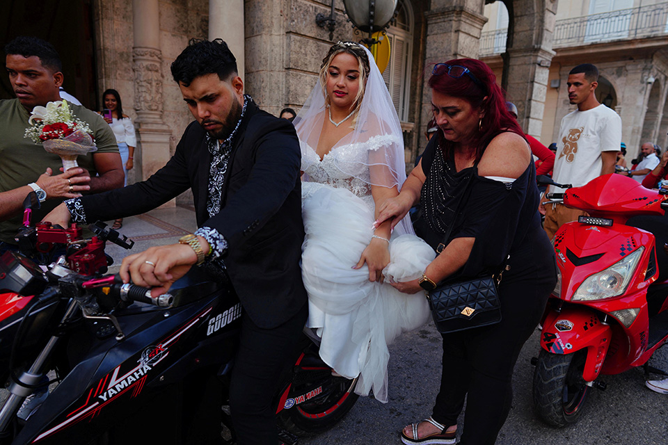 Με τα δίκυκλα πήγαν στη δεξίωση, αλλά και πριν, στον γάμο, οι νεόνυμφοι Daaniley Aguiar και Reinier Lopez στην Αβάνα. Λόγω της έλλειψης καυσίμων στο νησί, η χρήση ηλεκτρικών μεταφορικών μέσων είναι η μόνη λύση.