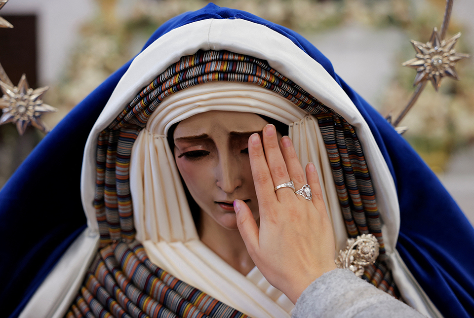Ετοιμάζονται σιγά σιγά για το Πάσχα και ιδιαίτερα στην Ισπανία η παράδοση είναι γεμάτη από θρησκευτικές εκδηλώσεις. Στο πλαίσιο αυτής της προετοιμασίας, έδωσαν την δυνατότητα σε άτομα με περιορισμένη όραση να ανακαλύψουν με τα δάχτυλά τους τα λατρευτικά αγάλματα των ναών, ιδιαίτερα της Παναγίας και του Χριστού βασανισμένα από το μαρτύριο. Στην φωτογραφία μια πιστή «βλέπει» από κοντά το άγαλμα της Παναγίας της θλίψης σε εκκλησία στην Ρόντα.
