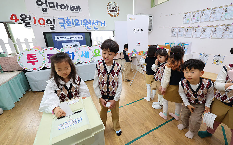 Με στολή και χωρίς παπούτσια μέσα στον χώρο του νηπιαγωγείου, οι μικροί μαθητές παίρνουν ένα βασικό μάθημα δημοκρατίας. Με αφορμή τις βουλευτικές εκλογές στην χώρα στις 10 Απριλίου, η τοπική οργάνωση που είναι υπεύθυνη για την διοργάνωση τους, ενέταξε και ένα μάθημα εκλογών όχι στο δημοτικό, αλλά στα νηπιαγωγεία της περιοχής Incheon.