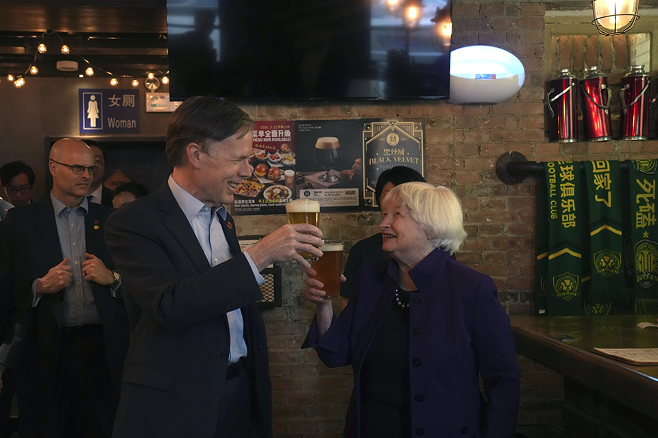 Δοκιμές μπύρας κάνουν λίγο πριν την έναρξη επίσημων συναντήσεων και εξαντλητικών συνομιλιών. Ο Αμερικανός πρέσβης στην Κίνα, Νίκολας Μπέρνς (έχει υπηρετήσει το αντίστοιχο πόστο του πρέσβη και στην Ελλάδα) τσουγκρίζει το ποτήρι του με την υπουργό οικονομικών των ΗΠΑ Τζάνετ Γέλεν που βρίσκεται στην χώρα για επίσημη επίσκεψη, στην ζυθοποιεία Jing -A στο Πεκίνο.