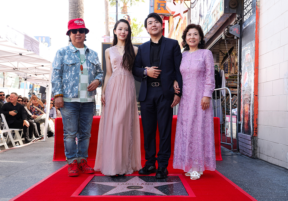 Το δικό του αστέρι στην Λεωφόρο της δόξας στο Λος Αντζελες, εκεί που οι κινηματογραφικοί αστέρες αφήνουν το όνομά τους για πάντα, απέκτησε ο Lang Lang. O σούπερ σταρ πιανίστας από την Κίνα πόζαρε όλος καμάρι με την σύζυγό του και τους γονείς του (αριστερά ο μπαμπάς με αθλητική ενδυμασία και κόκκινες πινελιές και δεξιά η μητέρα με βραδινό ένδυμα) ενώ δίπλα του η σύζυγός του.