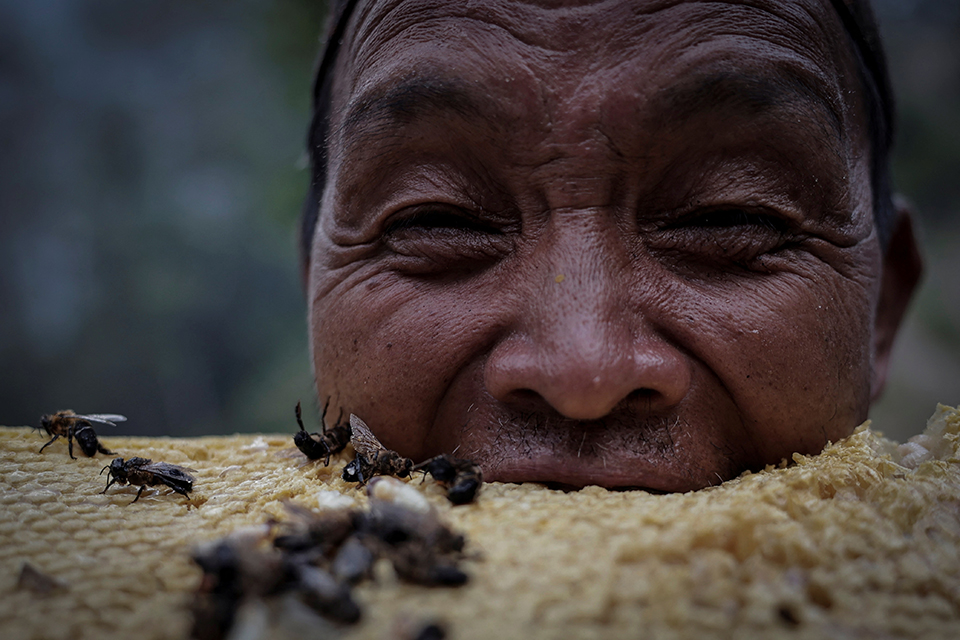 Ο Tek Prasad Gurung 64 ετών δαγκώνει με λαχτάρα μια φρέσκια κηρήθρα που μόλις έχει συλλέξει από το Taapστην περιοχή Lamjung του Νεπάλ. Το μέλι της περιοχής είναι γνωστό και για κάποιες ιδιαίτερες ιδιότητες που προκαλούν παραισθήσεις….