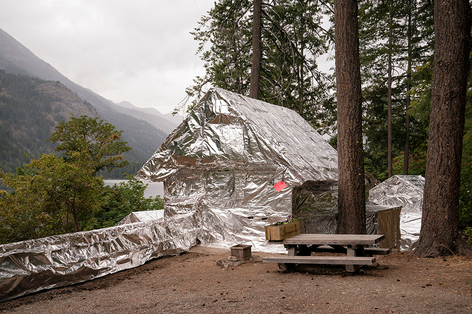 Δεν ξέρουν πως και προς τα που θα συνεχίσει ηφωτιά Pioneer να καίει. Για κάθε ενδεχόμενο όμως τύλιξαν τα ιστορικά κτίρια του Εθνικού Πάρκου στην ανατολική πλευρά της λίμνης Chelan με αντιπυρικό υλικό για να τα προστατεύσουν από τις φλόγες. Ολα αυτά το Stehekin της Ουάσιγκτον.