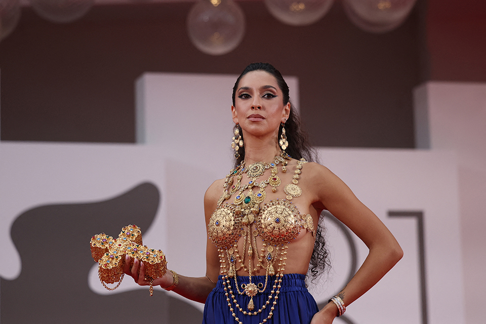 Αν και το όνομα της κυρίας δεν μας γνωστό, που σημαίνει ότι για τους φωτογράφους δεν είναι διάσημη, δεν πέρασε απαρατήρητη. Αλλωστε η όλη εμφάνιση σε αυτό αποσκοπούσε. Τα βυζαντινά κοσμήματα σαν μπλούζα και ο σταυρός ως τσάντα. Ολα αυτά στο φεστιβάλ Βενετίας και στην πρεμιέρα της καινούργιας ταινίας του Πέδρο Αλμοδόβαρ «The Room Next Door» που συμμετέχει στο διαγωνιστικό τμήμα της διοργάνωσης.