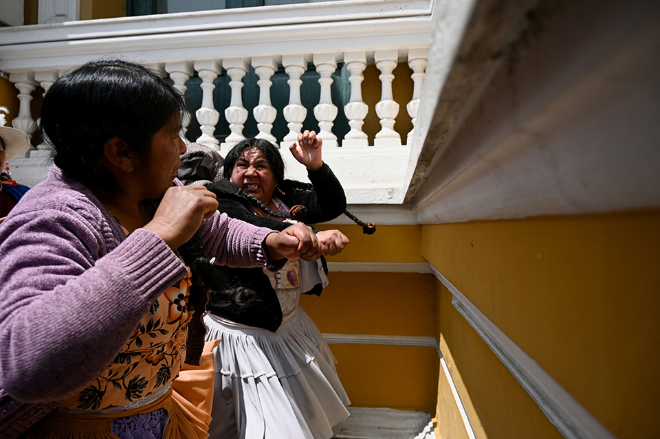 Με νύχια προτεταμένα αλλά και γροθιές (το μποξ είναι από τα πιο διαδεδομένα αθλήματα) δύο γυναίκες μάχονται για τους πολιτικούς στην Βολιβία. Από την μία η διαδηλώσεις για την υποστήριξη του προέδρου Luis Arce από την άλλη η ανακοίνωση της υποψηφιότητας του πρώην προέδρου Evo Morales οδήγησαν σε κανονικές συρράξεις μεταξύ οπαδών έξω από το κοινοβούλιο.