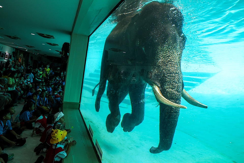Μα ναί. Παρά το τεράστιο μέγεθός τους κολυμπούν και το αποδεικνύουν στον ζωολογικό κήπο του Kheowστο Chondburiτης Ταϊλάνδης που η πισίνα τους έχει ειδικό τζάμι για να απολαμβάνουν οι επισκέπτες αυτό το μοναδικό θέαμα που είναι αδύνατο να δεις πουθενά αλλού.