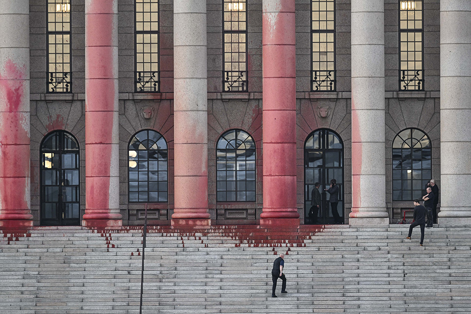Οι ακτιβιστές για το κλίμα ξέρουν ότι ο πλανήτης είναι ένας και έτσι γέμισαν με κόκκινες μπογιές την είσοδο του κοινοβουλίου στο Ελσίνκι για να διαμαρτυρηθούν για τα ορυχεία τύρφης στηνγειτονική Σουηδία που εκμεταλλεύεται η κρατική Neova.