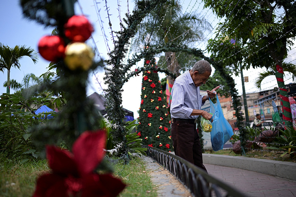 Δεν κοιτά τριγύρω τα στολίδια αλλά τα λιγοστά ψώνια στην τσάντα του ο κύριος της φωτογραφίας. Θα περίμενε κανείς οι πρώτες πόλεις που έχουν αρχίσει να στολίζουν για τα Χριστούγεννα να είναι αυτές με την μεγάλη εμπορική κίνηση. Το Λονδίνο ή η Νέα Υόρκη. Και όμως πρώτη του Οκτώβρη και το Καράκας γέμισε κόκκινες μπάλες και λαμπιόνια παντού καθώς σύμφωνα με διάταγμα(!) του Νικολά Μαδούρο ξεκίνησε επίσημα για την χώρα η χριστουγεννιάτικη περίοδος.
