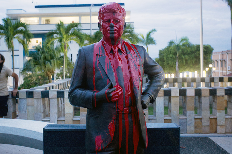 Κανένας πρόεδρος δεν γλίτωσε. Από τον δημοφιλή Κένεντι, μέχρι τον Ρούσβελτ και τον Αϊζενχάουερ. Ολα τα αγάλματα των προέδρων των ΗΠΑ στο Paseo de los Presidentes, που βρίσκεται στην Λεωφόρο του Συντάγματος μπροστά από το Καπιτώλιο του Σαν Χουάν βανδαλίστηκαν με κόκκινη μπογιά από ακτιβιστές που με αυτόν τον τρόπο θέλησαν να «απαντήσουν» στον χαρακτηρισμό «σκουπίδια» που απευθύνθηκε από κωμικό σε προεκλογική συγκέντρωση του Ντόναλτ Τράμπ για τους κατοίκους του Πουέρτο Ρίκο.