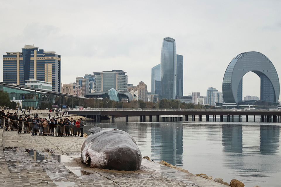 Με φόντο τα μοντέρνα κτίρια της πρωτεύουσας Μπακού η κολεκτίβα «Captain Boomer» εκθέτει το έργο της. Οι Βέλγοι καλλιτέχνες δημιούργησαν την τεράστια νεκρήαλλά εξαιρετικά αληθοφανή φάλαινα (μάλιστα κάποιος από αυτούς ντυμένος με ολόσωμη πλαστική φόρμα ρίχνει συχνά νερό πάνω της)που βρίσκεται έξω από το κτίριο που διεξάγεται η σύνοδος των Ηνωμένων Εθνών για το κλίμα Cop29 στο Αζερμπαϊτζάν.