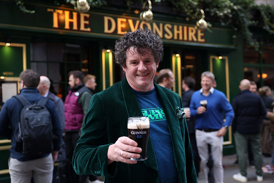 Ο χαμογελαστός κύριος, Oisin Rogers, ποζάρει για τον φακό με μια διάσημη Guinness στα χέρια. Η σκούρα μπύρα δεν άλλαξε συνταγή, άλλαξε όμως την ποσότητα του αλκοόλ, δίνοντας μια ακόμη εναλλακτική σε όσους την προτιμήσουν. Κυκλοφόρησε με 0.0 αλκοόλ σε βαρέλι στην pub « The Devonshire» στο Σόχο του Λονδίνου.