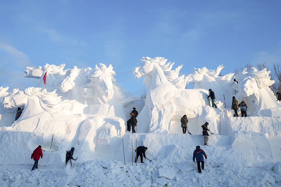Γλύπτες και εργάτες δουλεύουν μαζί. Το τεράστιο έργο με τα άλογα που καλπάζουν και τις χαίτες τους να ανεμίζουν στον αέρα, έχει ακόμη δουλειά. Γενικότερα, η 37 έκθεση Χιονιού στην Harbin της επαρχίας Hailongjiang δεν είναι ακόμη ολοκληρωμένη, έχει όμως ανοίξει δοκιμαστικά, καθώς το επόμενο διάστημα στο τεράστιο χιονισμένο πάρκο θα συρρεύσουν δεκάδες χιλιάδες επισκεπτών.