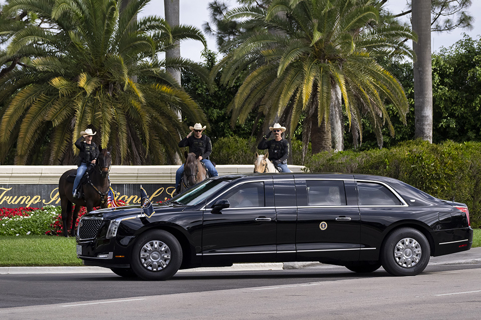 Μετά τα ρομπότ σκυλιά που χρησιμοποιούνται για την ασφάλειά του σειρά έχουν και οι έφιπποι από το Palm Beach County Sheriff’s Department που στην φωτογραφία χαιρετούν τον πρόεδρο κατά την άφιξή του στο Golf Club του.