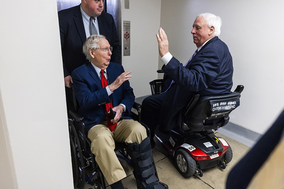 Τα 83 του γενέθλια επέλεξε ο Μιτς ΜακΚόνελ (αριστερά) για να ανακοινώσει ότι δεν θα επιδιώξει μια νέα θητεία. Ο ρεπουμπλικανός γερουσιαστής είναι ο μακροβιότερος ηγέτης του κόμματος της Γερουσίας στην ιστορία των ΗΠΑ έχοντας εκλεγεί επτά φορές. Στην φωτογραφία ο ΜακΚόνελ καθώς κατευθύνεται προς την γερουσία για να ανακοινώσει την απόφασή του, χαιρετά τον γερουσιαστή, επίσης ρεπουμπλικανό Τζιμ Τζάστις.