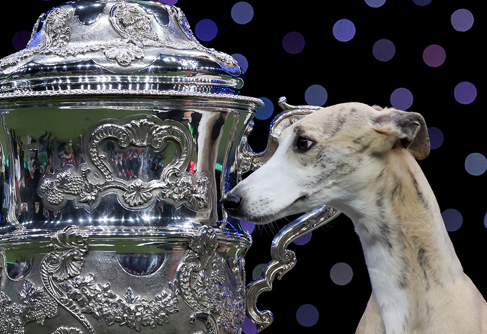 Η Miuccia ένα πανέμορφο whippet είναι η νικήτρια στο Crufts Dog Show στο Birmingham και ποζάρει την τελευταία ημέρα του σόου μαζί με το τεράστιο βραβείο της.