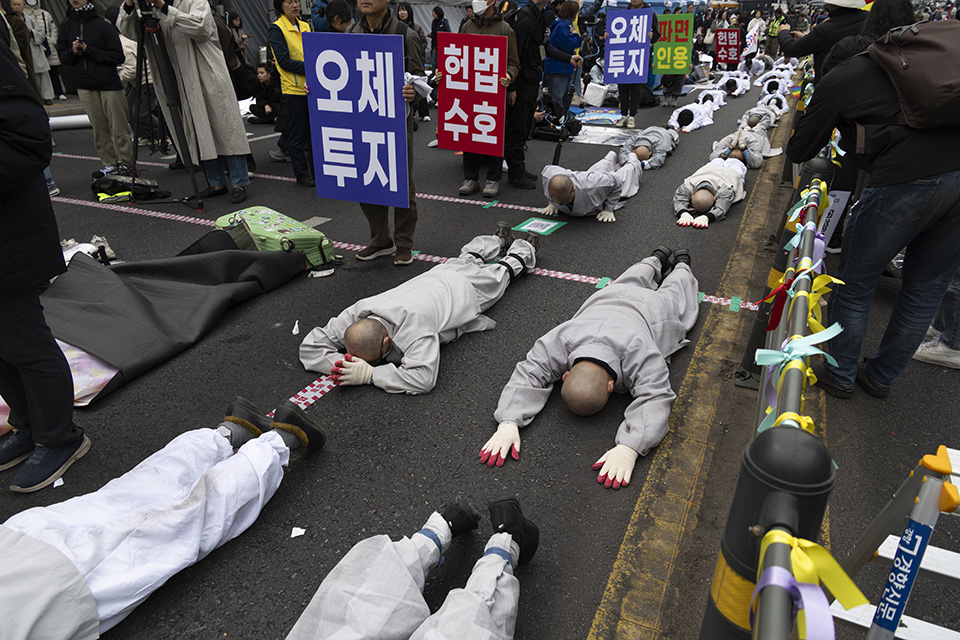 Εν αναμονή της απόφασης του συνταγματικού δικαστηρίου της Νοτίου Κορέας για την αποπομπή του προέδρου Yoon Suk Yeol για την επιβολή του στρατιωτικού νόμου στην χώρα, οι μοναχοί διαδηλώνουν διατηρώντας την τυπική προσευχή Dharna, κάνοντας τρία βήματα και μετά ξαπλώνοντας στο έδαφος, όλα αυτά στην διαδρομή για το δικαστήριο.