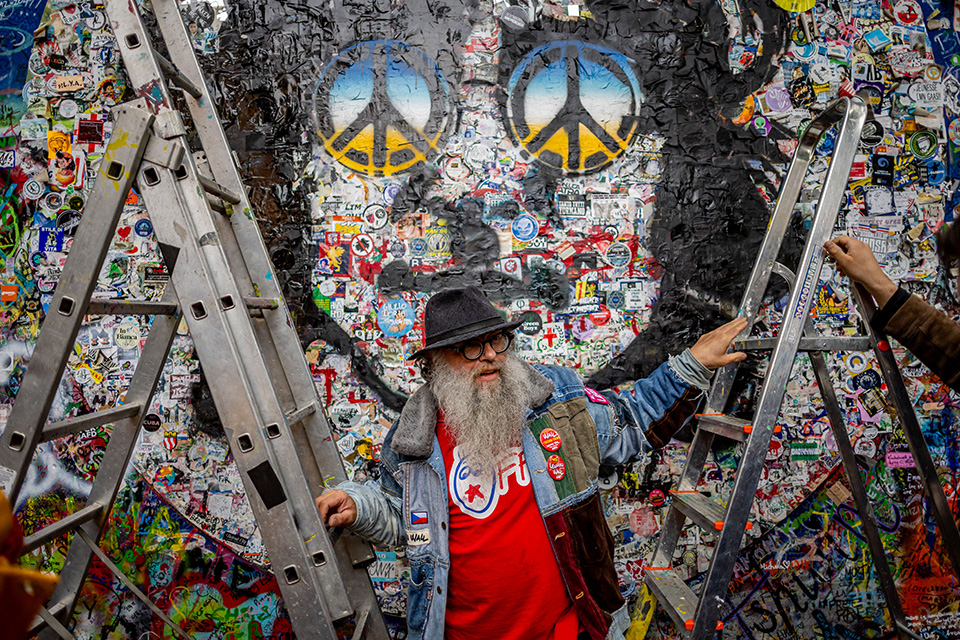 Ο Τσέχος καλλιτέχνης Pavel Stastny ποζάρει μπροστά από το τείχος του Λένον. Το μνημείο στο κέντρο της Πράγας δημιουργήθηκε μάλλον αυθόρμητα με την είδηση του θανάτου του στις 08 Δεκεμβρίου 1980. Σιγά σιγά, ο κόσμος συγκεντρωνόταν και άναβε κεριά, με τον καιρό έγραφε συνθήματα και έγινε το σύμβολο της Δύσης, φέτος γιορτάζει τα 45 χρόνια από την δημιουργία του.