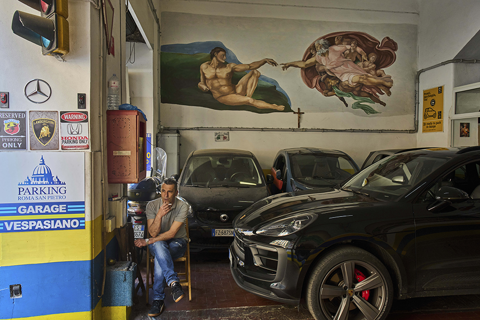 Μπορεί να λείπει το ταλέντο του Μιχαήλ Αγγελου από την τοιχογραφία αλλά το πάρκινγκ στην Ρώμη έχει ένα αντίγραφο της γέννεσης που κοσμεί την Καπέλα Σιστίνα, σημείο ενδιαφέροντος των καθολικών όλου του κόσμου αυτή την στιγμή.
