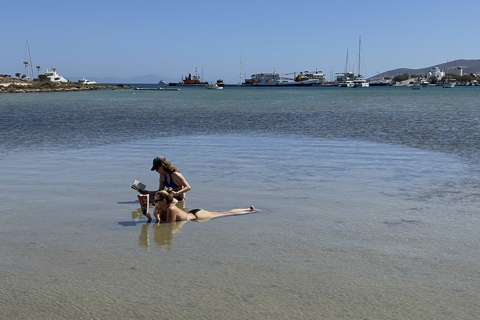 Χωρίς κινητό, χωρίς ομπρέλα και σκιά, αλλά με ένα βιβλίο στο χέρι, δύο κυρίες απολαμβάνουν το δικό τους (ζεστό) ελληνικό καλοκαίρι στα αβαθή της παραλίας της Αντιπάρου.