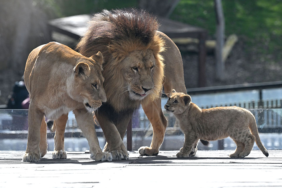 Το λιοντάρι Mlinzi και η λιονταρίνα Nairibi κοιτούν με αυτό το χαρακτηριστικό βλέμμα των γονιών (σε κάθε είδος) το βλαστάρι τους Nyra. Το λιονταράκι έκανε την εμφάνισή του στο κοινό του ζωολογικού κήπου της Καμπέρα στην Αυστραλία που «τρέχει» ένα από τα πιο σημαντικά προγράμματα διατήρησης του συγκεκριμένου είδους.