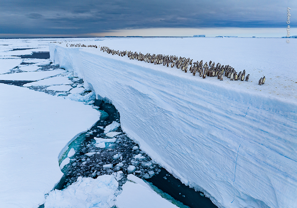 Νεοσσοί αυτοκρατορικών πιγκουίνων βαδίζουν στην άκρη του πάγου ψάχνοντας τρόπο να βουτήξουν για να τραφούν. Ο φωτογράφος πέρασε δύο μήνες μαζί τους στην Ανταρκτική για να απαθανατίσει το συγκεκριμένο στιγμιότυπο.