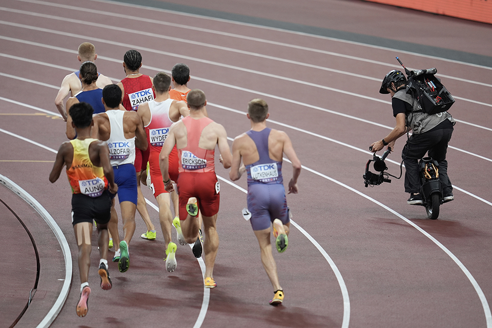Εχει βοηθήσει πολύ η τεχνολογία αλλά και οι εικονολήπτες/ φωτογράφοι δίνουν τον καλύτερό τους εαυτό, χρησιμοποιώντας την στο έπακρο. Οι φωτογραφίες από το Παγκόσμιο Πρωτάθλημα Στίβου στο Τόκιο αποτυπώνουν σπάνιες στιγμές με τις κάμερες άλλοτε τοποθετημένες στα πιο απίστευτα σημεία (καθώς μικρές πια, ψηφιακές και με λειτουργία από απόσταση) ή στα χέρια των εκπληκτικών φωτογράφων. Στην φωτογραφία ένας εικονολήπτης μεταδίδει ζωντανά, πάνω σε με ρόδα- πατίνι τα 800 μέτρα ανδρών.