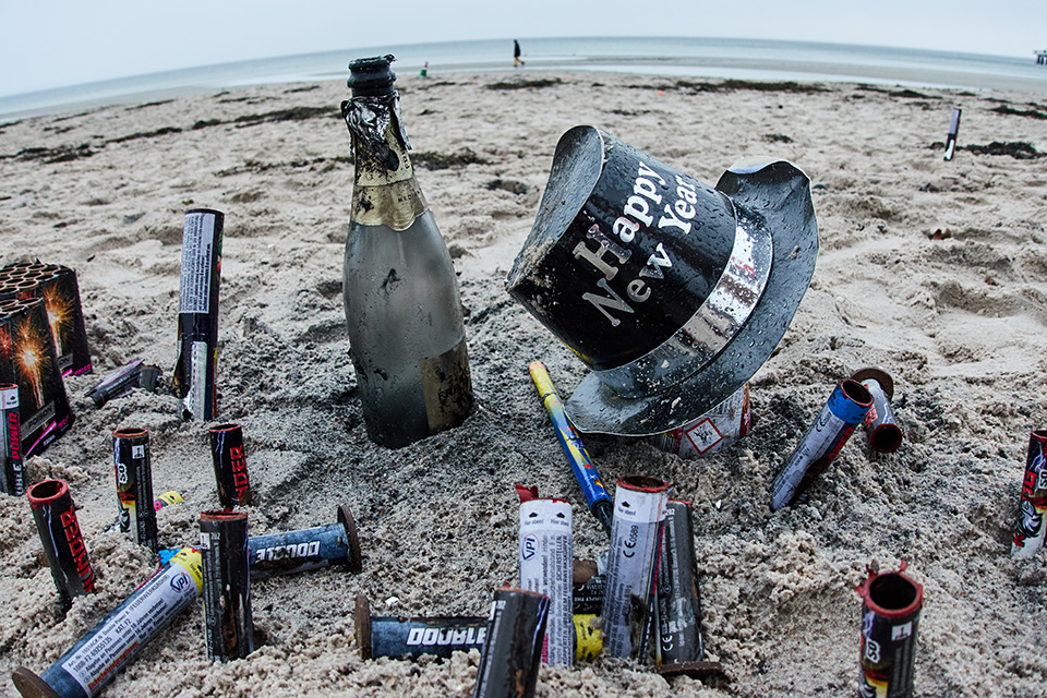 Κοντά στην θάλασσα και με μια βουτιά για τους πιο τολμηρούς, γιορτάζεται συνήθως η νέα χρονιά καθώς πολλοί νιώθουν την ανάγκη «βαπτίσματος» και εξαγνισμού. Στην φωτογραφία ό,τι απέμεινε από βεγγαλικά και σαμπάνιες από τους εορτασμούς σε παραλία της Βαλτικής στο Scharbeutz στην Γερμανία.