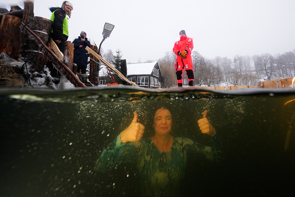Επιφάνειες πάγου κομμένες με πριόνι, ξύλινες σκάλες και υποβρύχιες εξέδρες για να βγαίνουν οι πιστοί γρήγορα έξω, πόζες και θρησκευτική κατάνυξη. Αυτά και άλλα πολλά ακόμα είχαν τα θεοφάνια που γιορτάστηκαν από τους παλαιοημερολογίτες. Οπως στην Αγία Πετρούπολη από όπου η φωτογραφία με την κυρία να δείχνει στον φακό ότι είναι «όλα καλά» στην διάρκεια της βουτιάς της στα παγωμένα νερά.