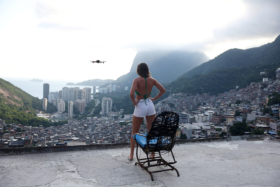 Η εικονιζόμενη ταράτσα έγινε γρήγορα viral. Βρίσκεται στην φαβέλα Rocinha, τόπος απροσπέλαστος μέχρι πριν λίγο καιρό τόσο για την αστυνομία, πόσο μάλλον δε για τους τουρίστες. Φυσικά η περίπτωση ενός καλού κέρδους πολλά πράγματα αλλάζει και ξαφνικά οι φαβέλες του Ρίο ντι Τζάνέιρο έγιναν τουριστικός προορισμός. Μαζί με τους τουρίστες ήρθαν και ένα σωρό υπηρεσίες εξυπηρέτησης, όπως η φωτογράφιση και βιντεογράφιση με drone όπως στην φωτογραφία, με την κοπέλα να ποζάρει στην Porta do Ceu ή αλλιώς Πόρτα του Ουρανού όπως είναι γνωστή η ταράτσα.