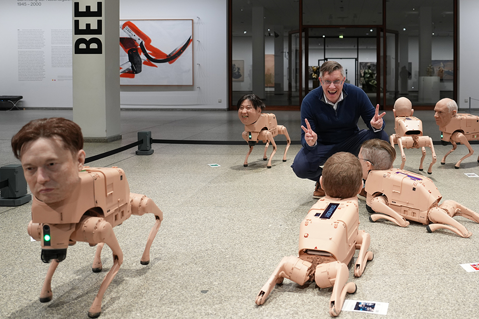 Ο Mike Winkelmann είναι Αμερικανός καλλιτέχνης γνωστός ως Beeple. Τα έργα του αιχμηρά και πολιτικά, ενώ θεωρείται από τους κορυφαίους στα NFT . Αυτή την φορά εκθέτει στην Neue Nationalgalerie του Βερολίνου το εικονιζόμενο έργο με τίτλο «Regular Animals» όπου χρησιμοποιεί ρομπότ σκύλους που φορούν μάσκες των Ελον Μασκ, Κιμ Γιονγκ Ουν αλλά και Πάμπλο Πικάσσο.