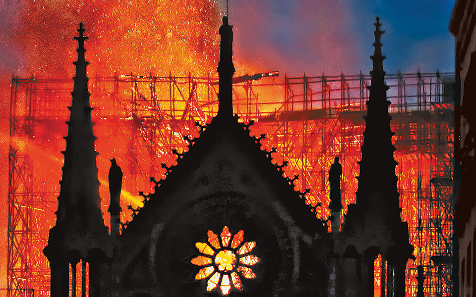 Χθες, Μεγάλη Δευτέρα των Καθολικών, ήταν οι καμπάνες των άλλων εκκλησιών του Παρισιού που ήχησαν σε θλιβερούς τόνους για τη Νοτρ Νταμ. Γύρω στις επτά παρά δέκα το απόγευμα, μια πυρκαγιά ξέσπασε στην οροφή αυτού του θαύματος της γοτθικής αρχιτεκτονικής. Σε χρόνο μηδέν κατέτρωγε τον ξύλινο σκελετό και τα έξοχα ξυλόγλυπτα. Πλήθη αποσβολωμένων Γάλλων και τουριστών παρακολουθούσαν από την πλατεία Δημαρχείου και τη γέφυρα Σεν Μισέλ την πυκνή στήλη μαύρου καπνού και τις πύρινες γλώσσες που έζωναν το μνημείο. Παρά τις απεγνωσμένες προσπάθειες των πυροσβεστών, ο κεντρικός πυργίσκος, ύψους 130 μέτρων, κατέρρευσε, για να ακολουθήσει η ολοκληρωτική καταστροφή της οροφής. Αργά το βράδυ, είχε τυλιχθεί στις φλόγες και ο ένας από τους δύο πύργους των κωδωνοστασίων, στην πρόσοψη της εκκλησίας, ενώ εκφράζονταν φόβοι για την αντοχή του τρούλου της. Οι πυροσβέστες προσπαθούσαν να σώσουν τα φημισμένα βιτρό, ενώ μικρή παρηγοριά προσέφερε η είδηση ότι 16 μεγάλης αξίας αγάλματα σώθηκαν από την πυρκαγιά, καθώς είχαν απομακρυνθεί πριν από λίγες ημέρες για έργα συντήρησης.