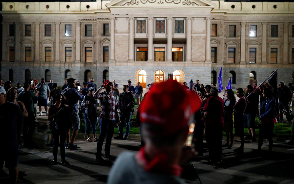 Φωνάζοντας «Σταματήστε την κλοπή!» και «Μετρήστε την ψήφο μου!», οι διαδηλωτές –οι περισσότεροι από τους οποίους δεν φορούσαν μάσκα– συγκεντρώθηκαν μπροστά από το εκλογικό κέντρο στην Μαρικόπα του Φοίνιξ.