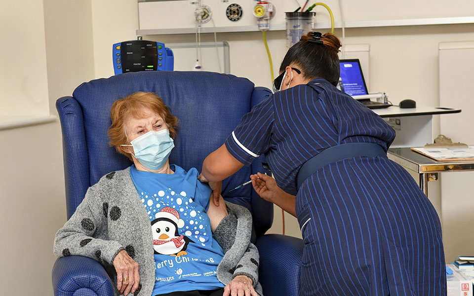 Η 90χρονη Μάργκαρετ Κίναν στη Μεγάλη Βρετανία, είναι ο πρώτος άνθρωπος παγκοσμίως στον οποίο χορηγήθηκε το εμβόλιο της Pfizer, εκτός του πλαισίου δοκιμών.