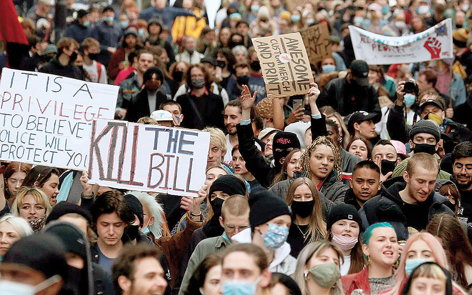 ΛΟΝΔΙΝΟ. Επτά διαδηλωτές είχαν συλληφθεί μέχρι χθες το απόγευμα στο Μπρίστολ της Αγγλίας, ύστερα από τις ταραχές που ξέσπασαν τη νύχτα της Κυριακής στο περιθώριο διαδήλωσης κατά του νομοσχεδίου που αφορά την αστυνομία. Σε χθεσινή της ανακοίνωση, η αστυνομία της πόλης απέδωσε τη βία σε ακραία στοιχεία, τα οποία παρεισέφρησαν στη διαδήλωση, για να προσθέσει ότι πολλές ακόμη συλλήψεις αναμένονται εντός των προσεχών ωρών, καθώς η αστυνομία επεξεργάζεται το υλικό από κάμερες ασφαλείας.