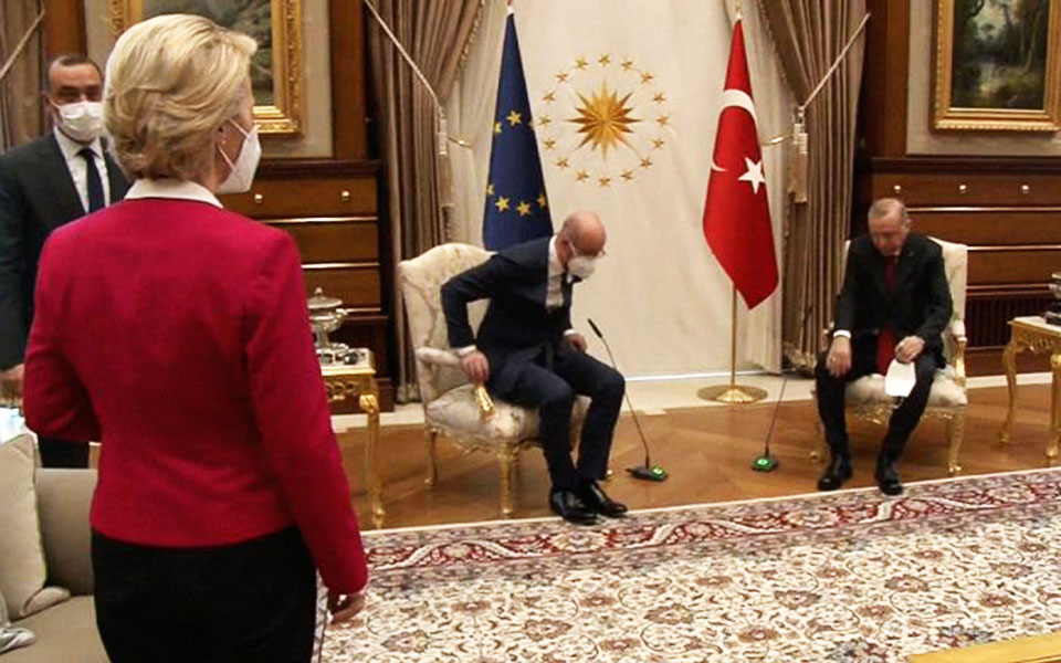 Στο βίντεο φαίνονται ο κ. Μισέλ και ο κ. Ερντογάν να κάθονται στις δύο πολυθρόνες, ενώ η κ. Φον ντερ Λάιεν στέκεται όρθια και αμήχανη, κοιτάζοντάς τους και χωρίς να γνωρίζει πού θα καθίσει η ίδια. «“Εχμμ” [το αμήχανο επιφώνημα της προέδρου] είναι ο νέος όρος για το πώς δεν πρέπει να είναι η σχέση Ε.Ε. – Τουρκίας», σχολίασε στο Twitter ο Γερμανός ευρωβουλευτής Σεργκέι Λαγκοντίνσκι, επικεφαλής της κοινής κοινοβουλευτικής επιτροπής Ε.Ε. – Τουρκίας.