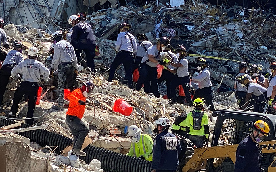 Οι επιχειρήσεις έρευνας και διάσωσης συνεχίζονται για έκτη ημέρα σήμερα στα ερείπια του 12όροφου συγκροτήματος κατοικιών Champlain Towers South στη Φλόριντα, όπου τουλάχιστον 11 άνθρωποι έχουν χάσει τη ζωή τους ενώ άλλοι 150 θεωρούνται αγνοούμενοι και πιστεύεται ότι έχουν πεθάνει.