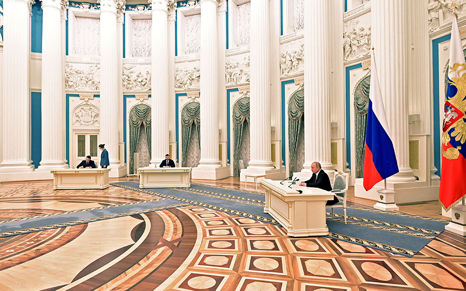- 21:58Αμέσως μετά το διάγγελμα της μίας ώρας, ο Πούτιν μετέβη σε μια επιβλητική αίθουσα του Κρεμλίνου και υπέγραψε το διάταγμα της αναγνώρισης των περιοχών του Ντονμπάς.