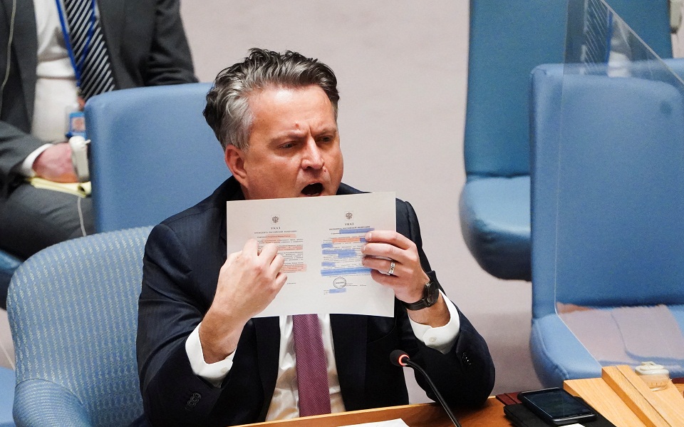 Ο πρεσβευτής της Ουκρανίας στον Οργανισμό Ηνωμένων Εθνών Σεργκέι Κίσλιτσια τόνισε παρεμβαίνοντας στην έκτακτη συνεδρίαση του Συμβουλίου Ασφαλείας ότι «τα διεθνώς αναγνωρισμένα σύνορα» της χώρας του «παραμένουν αμετάβλητα, ανεξαρτήτως των ανακοινώσεων και των ενεργειών» της Ρωσίας.