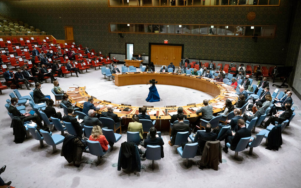 Στιγμιότυπο από την έκτακτη συνεδρίαση του Συμβουλίου Ασφαλείας (Σ.Α.) του Οργανισμού Ηνωμένων Εθνών (ΟΗΕ) για τις εξελίξεις στην Ουκρανία. Φωτ. Evan Schneider/United Nations via AP.