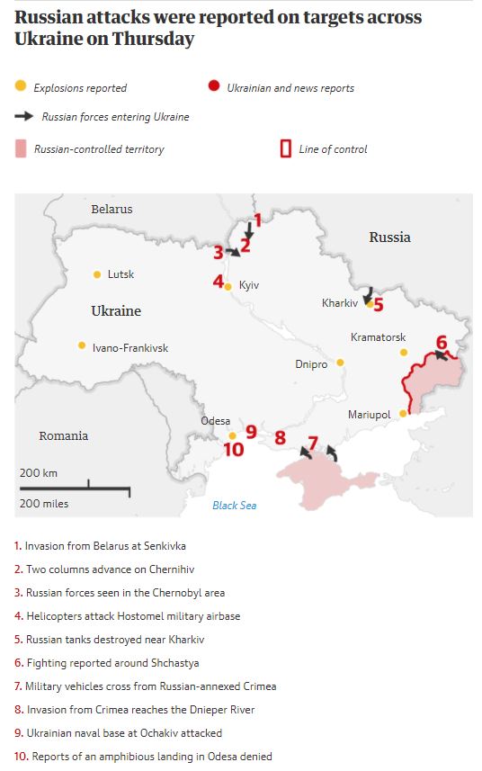 Ο υπουργός Εξωτερικών της Ουκρανίας Ντμίτρο Κουλέμπα ανακοίνωσε ότι έχει αρχίσει «εισβολή ευρείας κλίμακας» από τη Ρωσία και ότι αναφέρονται πλήγματα σε διάφορες περιοχές της χώρας.