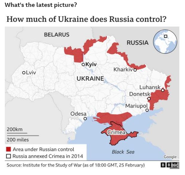 - 14:16Χάρτης που αναδημοσιεύει το BBC καταγράφει τα σημεία της ουκρανικής επικράτειας τα οποία ελέγχονται από ρωσικές δυνάμεις.