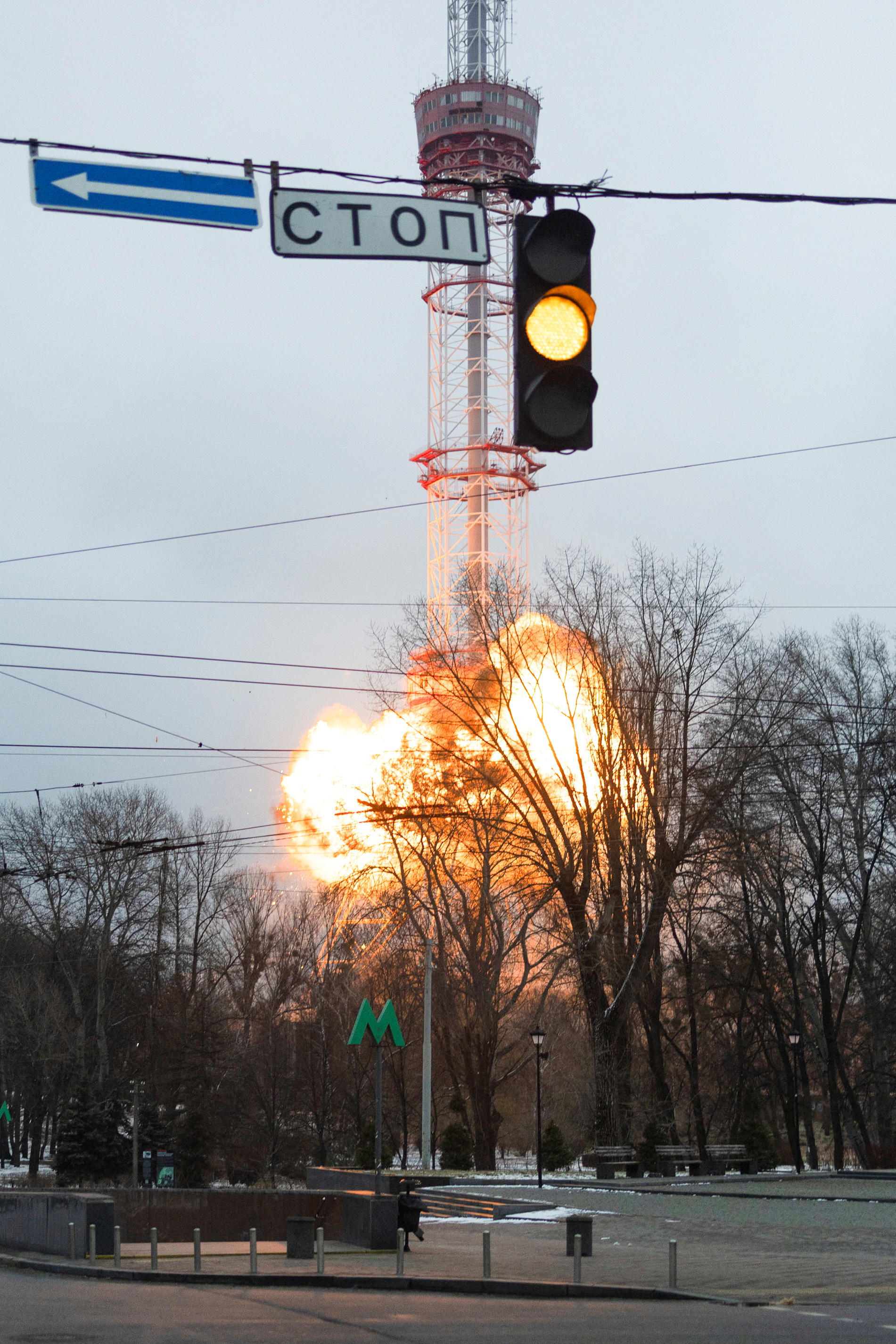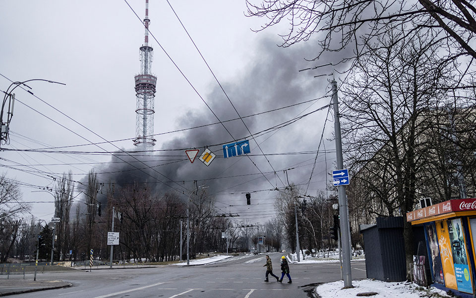 - 17:51Καπνός στον πύργο τηλεπικοινωνιών του Κιέβου. Φωτ. REUTERS/Carlos Barria