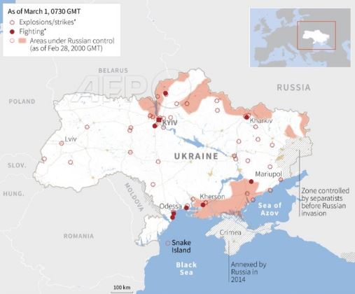 Σύμφωνα με τις βρετανικές μυστικές υπηρεσίες, η προέλαση των ρωσικών στρατιωτικών δυνάμεων στο Κίεβο έχει σημειώσει μικρή πρόοδο το τελευταίο 24ωρο λόγω υλικοτεχνικών προβλημάτων με τον στρατό να έχει αυξήσει τη χρήση του πυροβολικού βορείως της πρωτεύουσας.