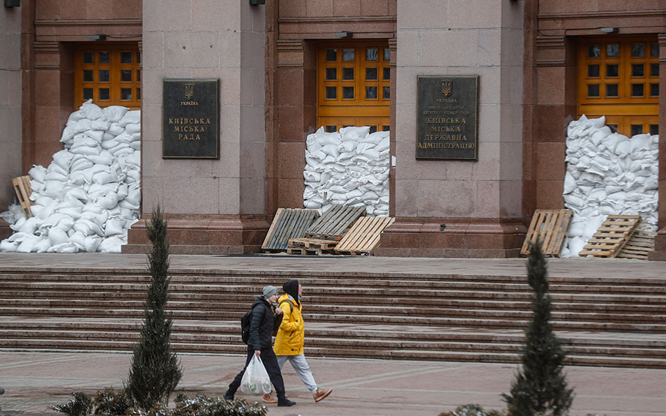 - 17:23Σάκοι με άμμο έξω από το δημαρχείο Κιέβου. Φωτ. EPA/ZURAB KURTSIKIDZE