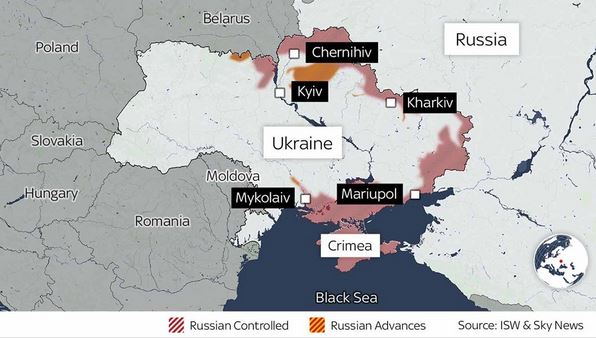 - Οι ρωσικές δυνάμεις έχουν κερδίσει έδαφος στον Νότο, σε μια προσπάθεια να περιορίσουν την πρόσβαση της Ουκρανίας στη θάλασσα. Προς το παρόν έχουν καταλάβει τη Χερσώνα, ενώ στο γειτονικό Μαϊκολάιβ σημειώνονται σφοδρές συγκρούσεις.
