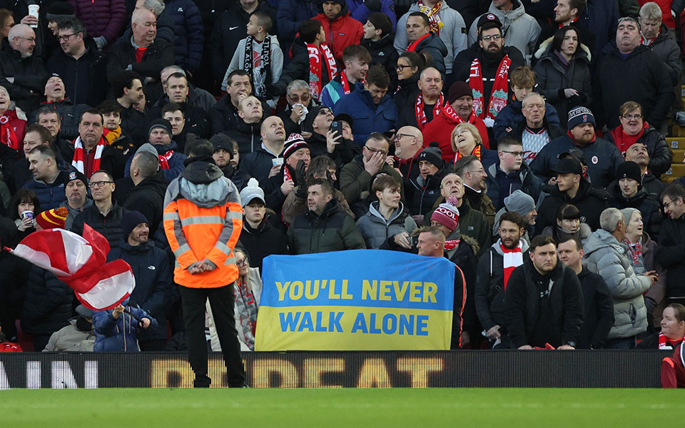 - 19:33Οι οπαδοί της Λίβερπουλ ανάρτησαν πανό με τα χρώματα της Ουκρανίας και το σύνθημα τους: You'll never walk alone