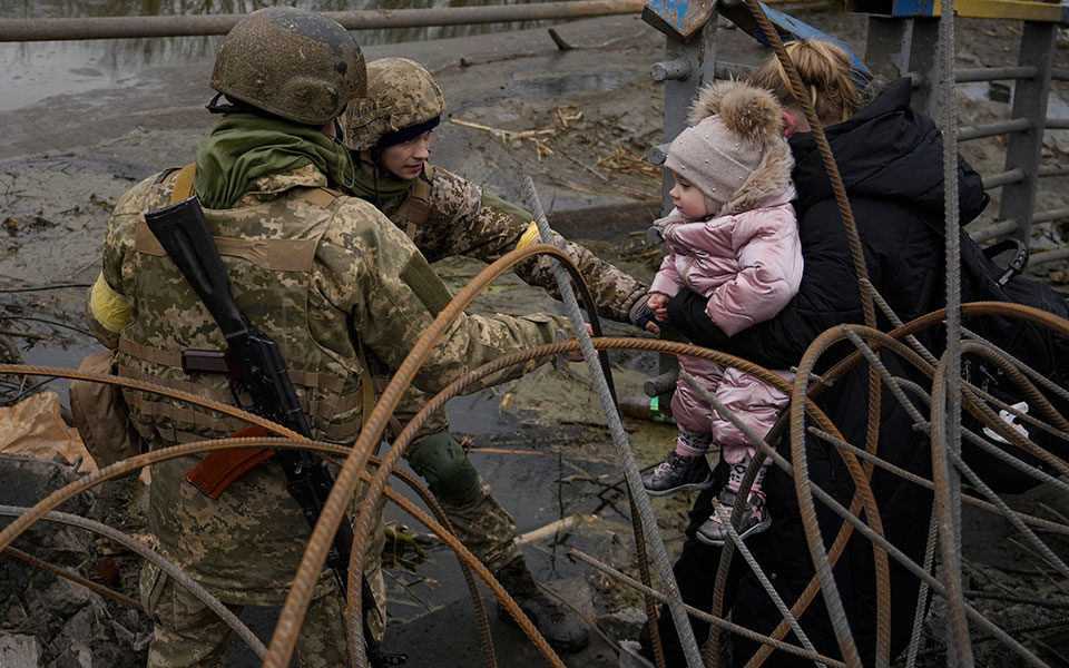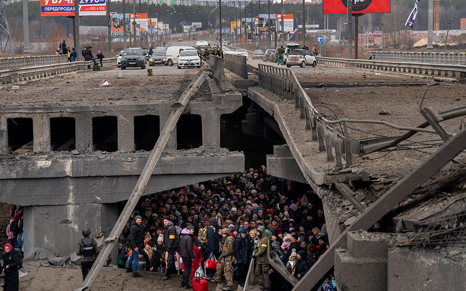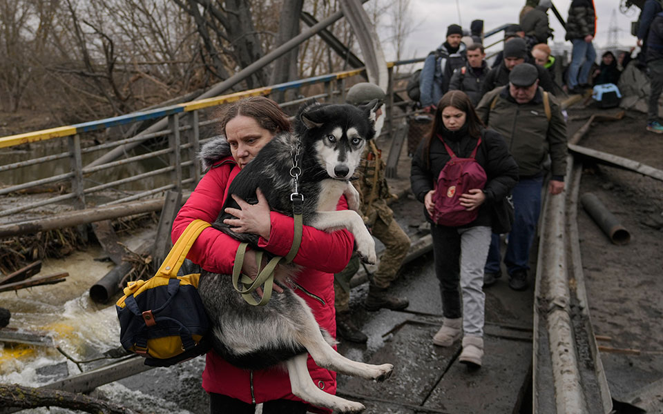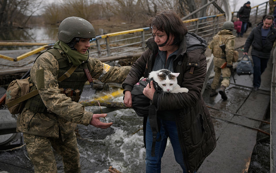 - 17:50Ουκρανή πρόσφυγας με τη γάτα της στην αγκαλιά της, διασχίζει τον ποταμό Ιρπίν, κάτω από μια γέφυρα που γκρέμισε ο Ρωσικός βομβαρδισμός