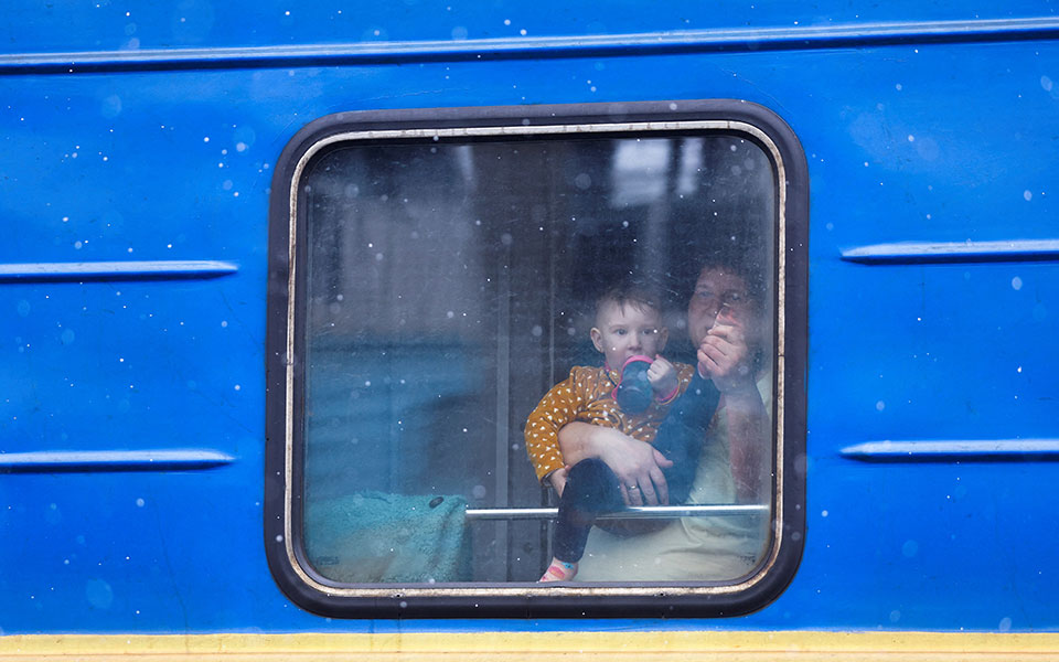Μια γυναίκα και ένα παιδί κοιτάζουν από ένα τρένο καθώς φεύγουν από την Ουκρανία προς την Πολωνία λόγω της εισβολής της Ρωσίας.